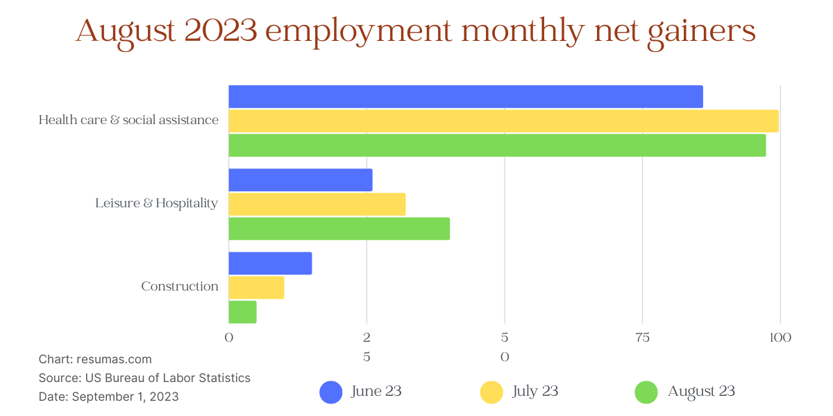 In conclusion, while the United States witnessed an addition of 187,000 jobs in August 2023, the overall unemployment rate rose by 0.3 percent, reaching 3.8%. Industries registering a monthly net gain included healthcare & social assistance, leisure and hospitality, and construction. Conversely, sectors exhibiting a net loss comprised transportation & warehousing, information and mining & logging.