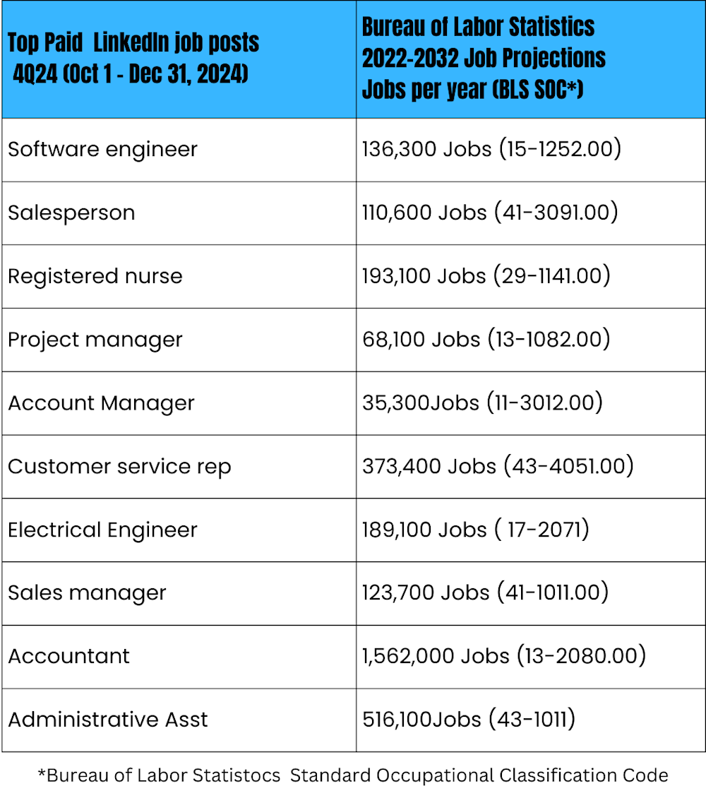 In this discussion, we provide an analysis that combines LinkedIn’s recent job posting data from the forth quarter of 2024 with the Bureau of Labor Statistics’ employment projections for 2022–2032, offering you beneficial insights.