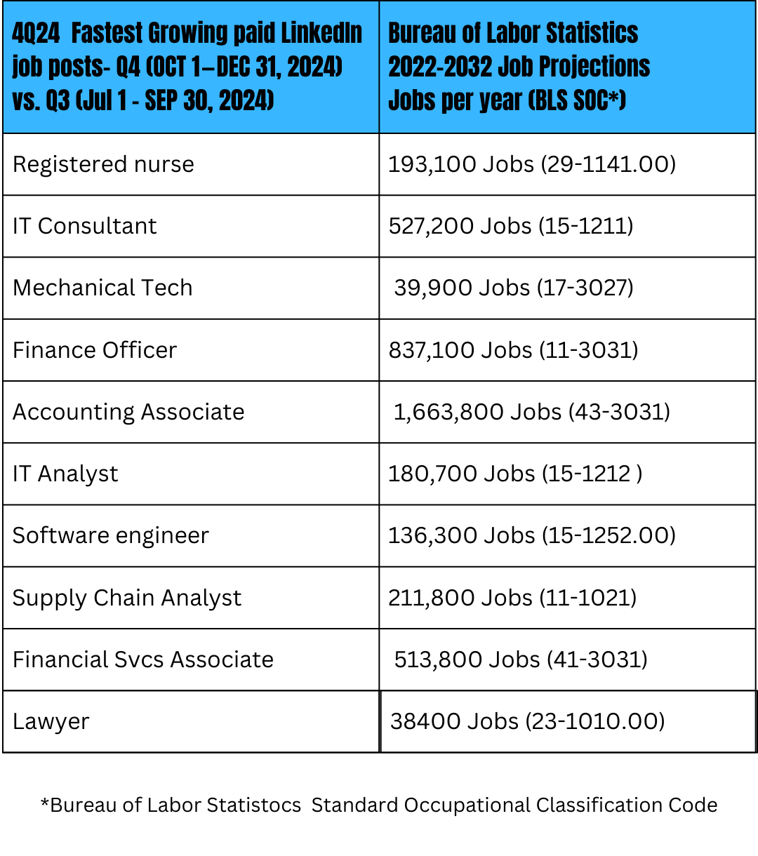 In this discussion, we provide an analysis that combines LinkedIn’s recent job posting data from the forth quarter of 2024 with the Bureau of Labor Statistics’ employment projections for 2022–2032, offering you beneficial insights.
